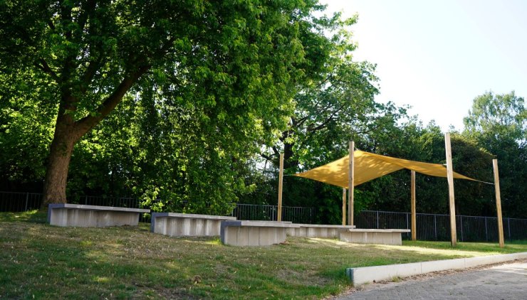 Het buitenlokaal, dit voorjaar geplaatst, oogt basaal: enkele betonnen bankjes in een cirkelopstelling en een doek, gespannen tussen wat palen, dat voor schaduw zorgt. Kosten: € 15.000. ‘Gelukkig hadden we nog budget uit de coronagelden. Samen met Simon Bergmans van het facilitair bedrijf en mijn collega’s van de ‘denktank’ Kitty Walravens en Maartje Schollen heb ik dit voor elkaar gekregen. Dat had nog best wat voeten in de aarde overigens. Je moet een geschikte plek zien te vinden en toestemming krijgen van allerlei commissies en instanties. Dat heeft Simon gelukkig allemaal geregeld.’